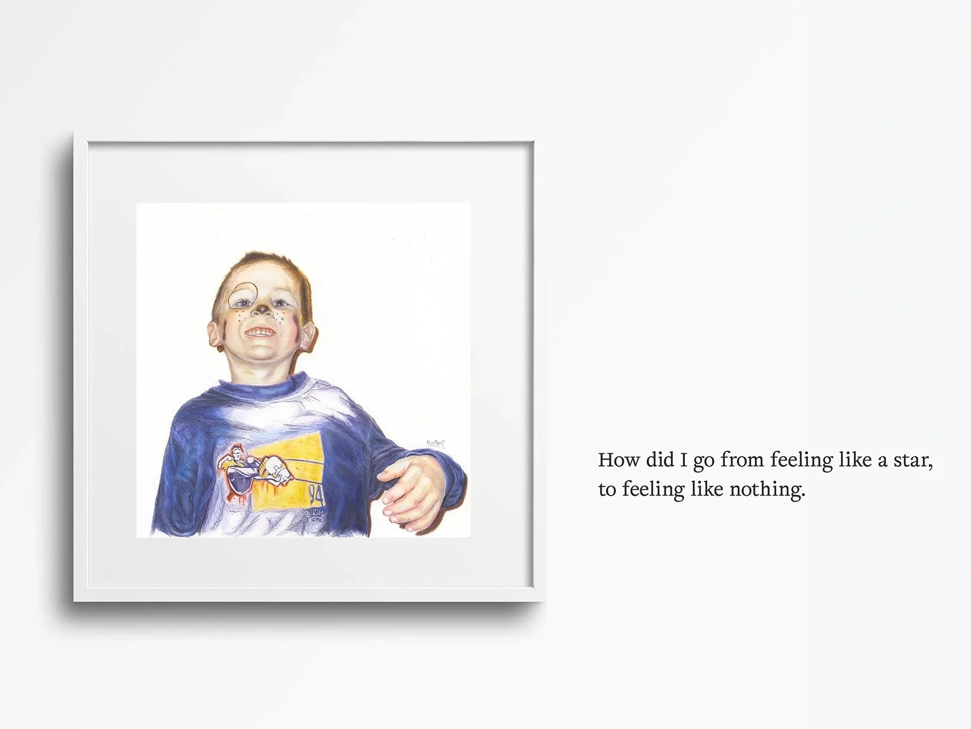 Growing up, we learn to put on a brave face. This moment represents the exhaustion and fragmentation that develop from emotional repression. Depicting the fragmentation and exhaustion from putting on masks for others to see. It becomes harder to remember who you are. The challenge is not how you should feel, but rather what it means to feel and express for yourself.